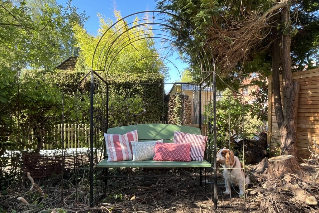 Nein, hinter der Bank geht es weder zu einer Kapelle noch zu einer Grotte. Dahinter ist unser Grundstück zu Ende und dort verläuft die Zufahrt zum nächsten Pfeifenstiel-Grundstück. Damit man uns nicht in den Rücken piecksen kann, werden wir die Sichtschutzwand um die Ecke rum fortsetzen und den Bogen noch begrünen.